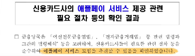현대카드는 법률적으로 우선 유권해석을 받아 독점이 아닌 우선 국내에 애플페이를 서비스하는 것입니다. 현대카드 독점 계약은 아니지만 우선 현대카드만 쓸수있습니다. 다른 카드 회사들은 금융위원회와 다시 유권해석을 해야하며 애플과의 수수료의 문제가 해결이 된 후에 사용이 가능할 것으로 보입니다. 하지만 현대카드의 경우에도 해외결제(VISA, MASTER) 가능 카드만 애플페이를 지원하기 때문에 이점은 꼭 참고하셔야 합니다.
