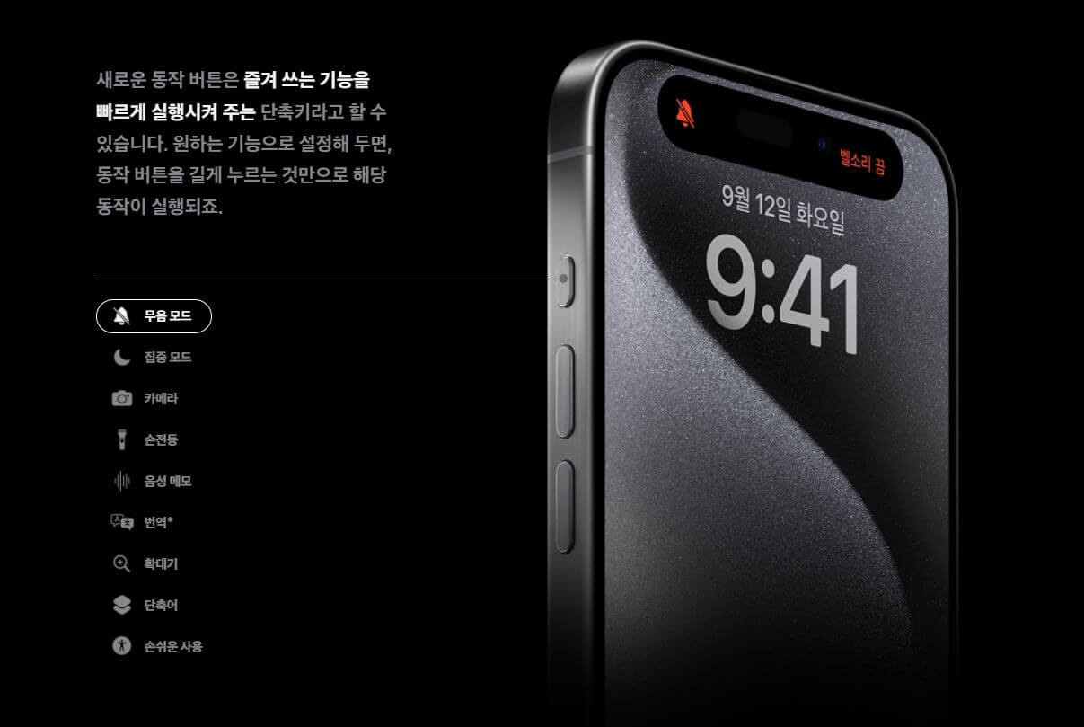 전통적인 무음 버튼을 대체한 "액션 버튼"이 새롭게 탑재되었습니다. 이 버튼은 무음 전환뿐만 아니라 다양한 기능으로 커스터마이징이 가능하며 각 상황에 맞게 다르게 작동합니다.