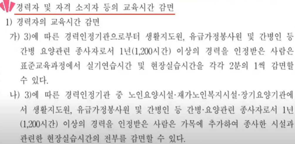 - 경력 및 자격 고려 : 이미 요양과 관련된 경력이 있는 간호사, 사회복지사 등의 국가 자격증을 소지한 경우 교육 시간을 단축할 수 있습니다.