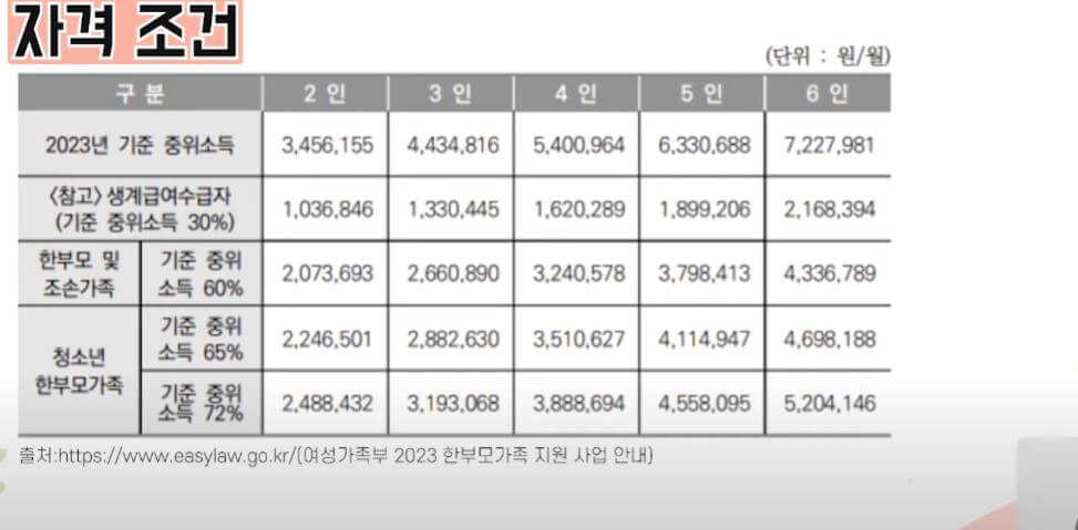 - 청소년 한부모 가족의 경우 이 금액은 중위 소득의 65%에 해당하는 약 225만 원 이하여야 합니다.