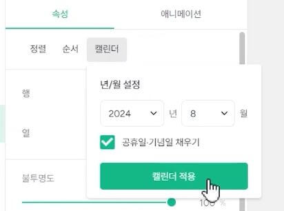 결혼식 날짜가 포함된 달력을 삽입하려면 왼쪽 상단의 "캘린더" 탭을 선택합니다. 년/월 설정에서 결혼식 날짜를 선택하고 "공휴일 기념일 채우기"를 클릭한 후 "캘린더 적용"을 눌러 템플릿에 추가합니다.