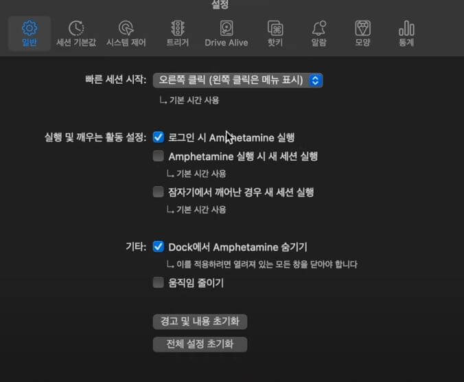 - Amphetamine를 실행한 후 설정에서 "로그인 시 Amphetmine 실행"을 클릭합니다. 이렇게 하면 맥북이 켜질 때마다 자동으로 앱이 실행됩니다.